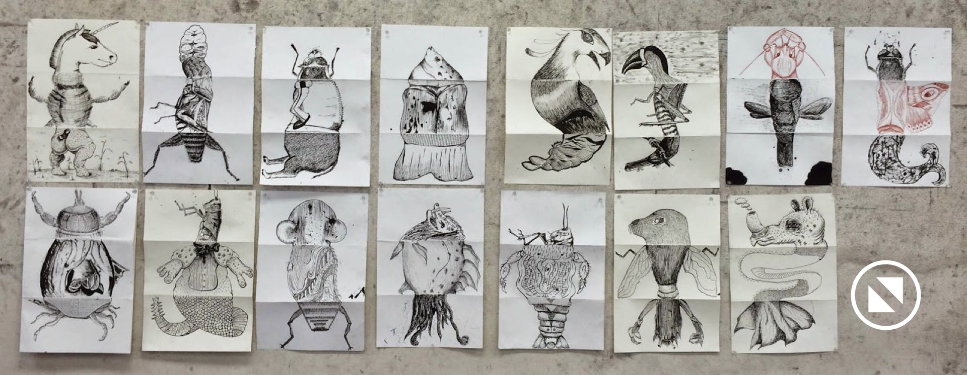 “Exquisite corpse” started as a french parlor game in the 1920’s, created by surrealist artists where participants play by taking turns drawing sections of a body on a sheet of paper, folded to hide each individual contribution. The first player adds a head then, without knowing what that head looks like, the next artist adds a torso, and so on. In this way, a strange, beautiful, one of a kind creature is born.